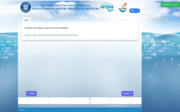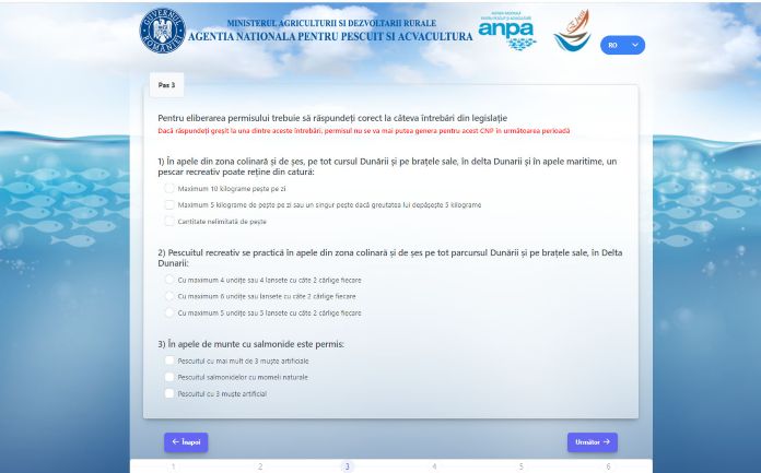 In aceasta faza se introduce in premiera un pas important si necesar in acelasi timp pentru obtinerea unui permis de pescuit ANPA 2023! Sub forma de test grila, va trebui sa raspundem corect la un numar de 3 intrebari. examen permis ANPA 2023Suntem informati despre faptul ca raspunsurile gresite la una din aceste intrebari nu va permite generarea unui permis pentru o perioada de timp. Ca metoda de identificare este luat in calcul CNP-ul introdus. Momentan, indiferent de raspunsuri, PERMISUL VA FI GENERAT! In viitor cu siguranta se vor aplica masurile de penalizare!