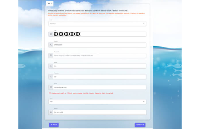 Urmatoarea etapa (pasul 2) este dedicata completarii datelor din cartea de identitate. Aici este necesar sa adaugam nume si prenume, adresa de domiciliu, numar de telefon de contact si adresa de e-mail. De mentionat este ca atat numele si prenumele este obligatoriu sa fie adaugate cu majuscule.