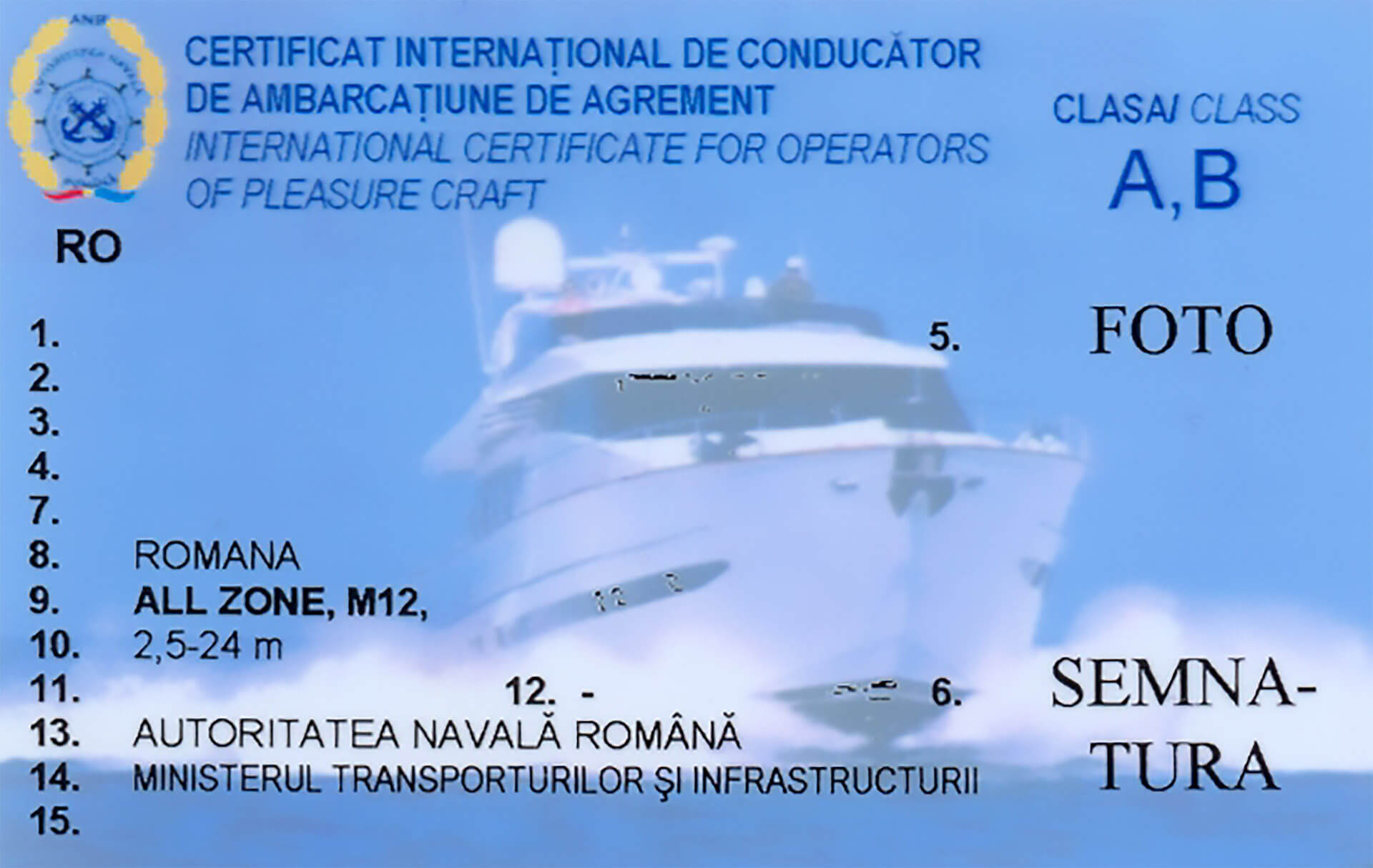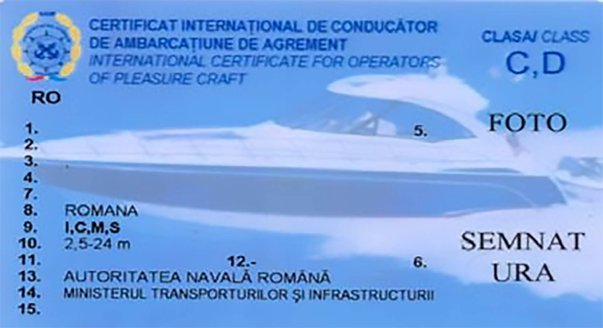 Acest certificat este un permis international de tip ICC – International Certificate for Operators of Pleasure Craft ( Certificat international de Operatori Ambarcatiuni de Agremenet ). Este emis de Autoritatea Navala Romana ( ANR ) si limiteaza detinatorul la conducerea ambarcatiunilor ce nu depasesc 24 de metri lungime in primul rand.