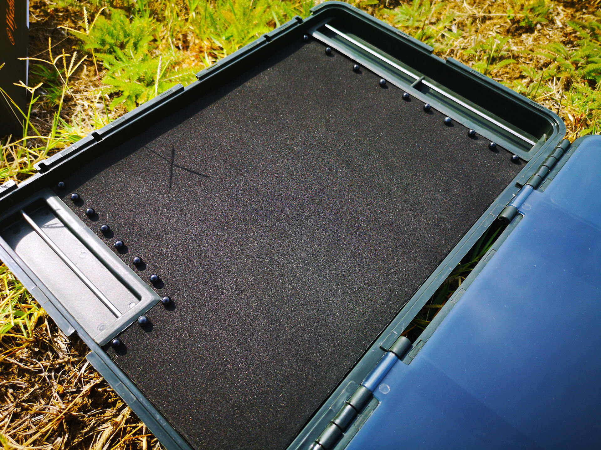 Are in componenta un penar aflat in partea superioara a cutiei. Vom transporta peste 40 de carlige legate. Penarul este insotit de 20 de pini pentru ancorarea carligelor legate.
